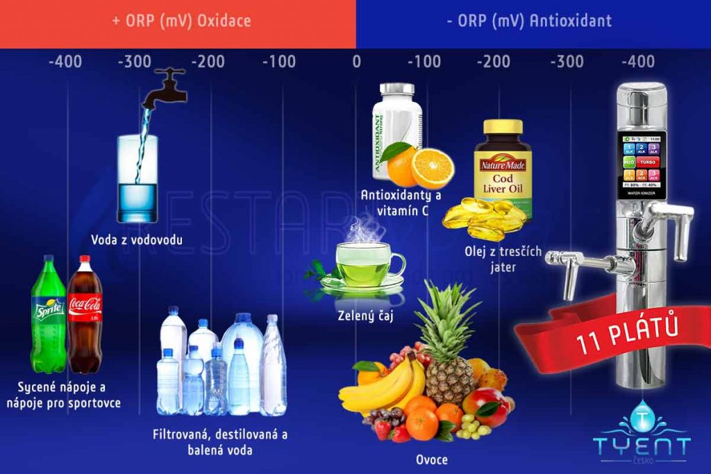 Ionizovaná voda má silnou zápornou hodnotu ORP – je schopná vázat se ve vysoké míře na tak zvané volné radikály. Volné radikály jsou agresivní formy kyslíku, které napadají zdravé tkáně. To vede k poškození buněk a k urychlení procesu stárnutí. Volné radikály vznikají při metabolických procesech v těle, ale přibývá jich i díky dalším jevům jako je např. nevyvážená strava, užívání stimulantů, stres, práce na počítači, telefonování s mobilním telefonem, znečištěné ovzduší atd. Přirozená obrana organismu je pak často těmito nepřirozenými jevy potlačována. Vitamíny nám v této situaci mohou do určité míry pomoci, ale ionizovaná voda má stejnou antioxidační sílu jako čerstvě vymačkané citrusové šťávy! Vyrábět si takto vodu je rychlé, účinné a velmi levné v porovnání s neustále stoupajícími cenami potravin, zvláště pak ovoce a zeleniny.