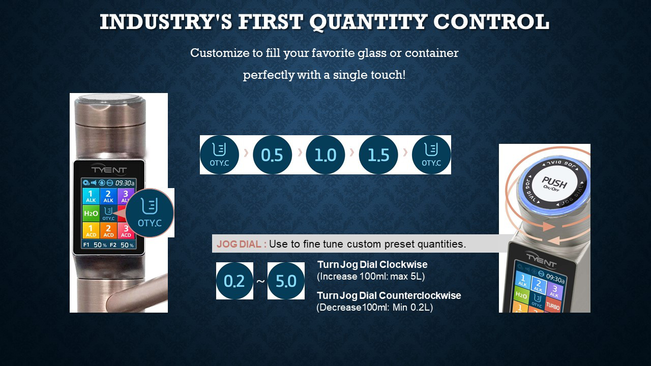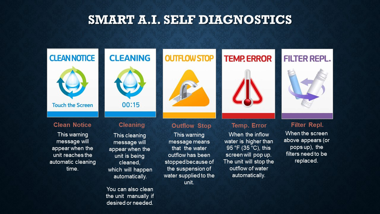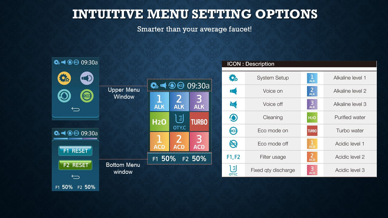 - 3 úrovně zásadité vody, 3 úrovně vody kyselé, 1 úroveň neutrální kojenecké vody (též pro zapíjení léků)